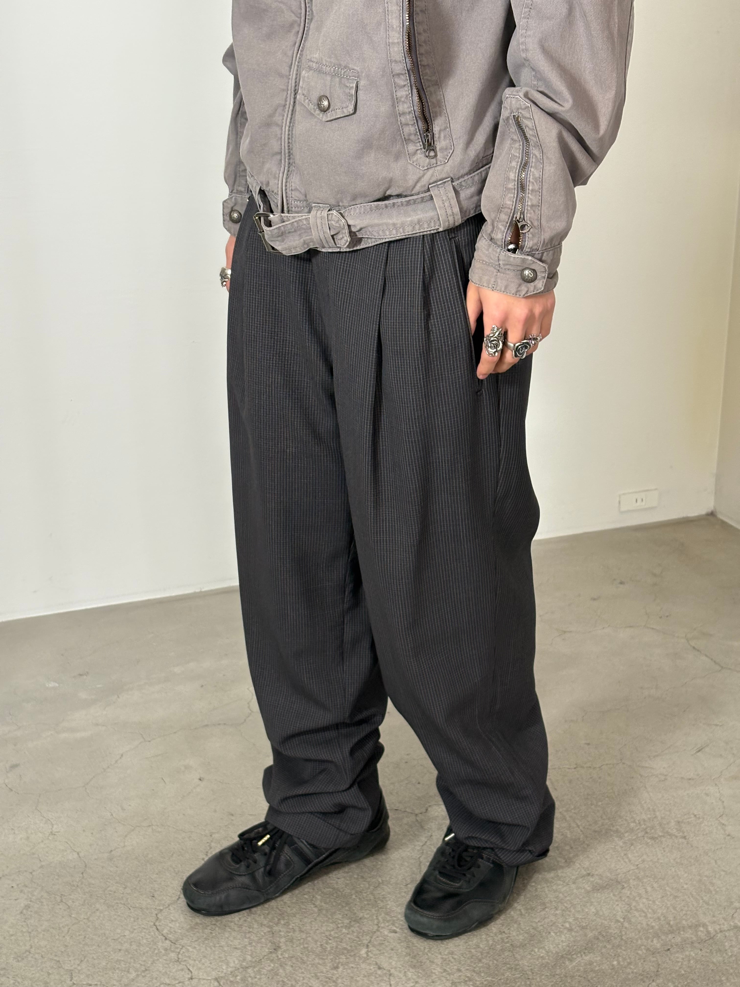 柄が効いてるスラックスですのでカジュアルにパーカーとの合わせも最高な一枚です。