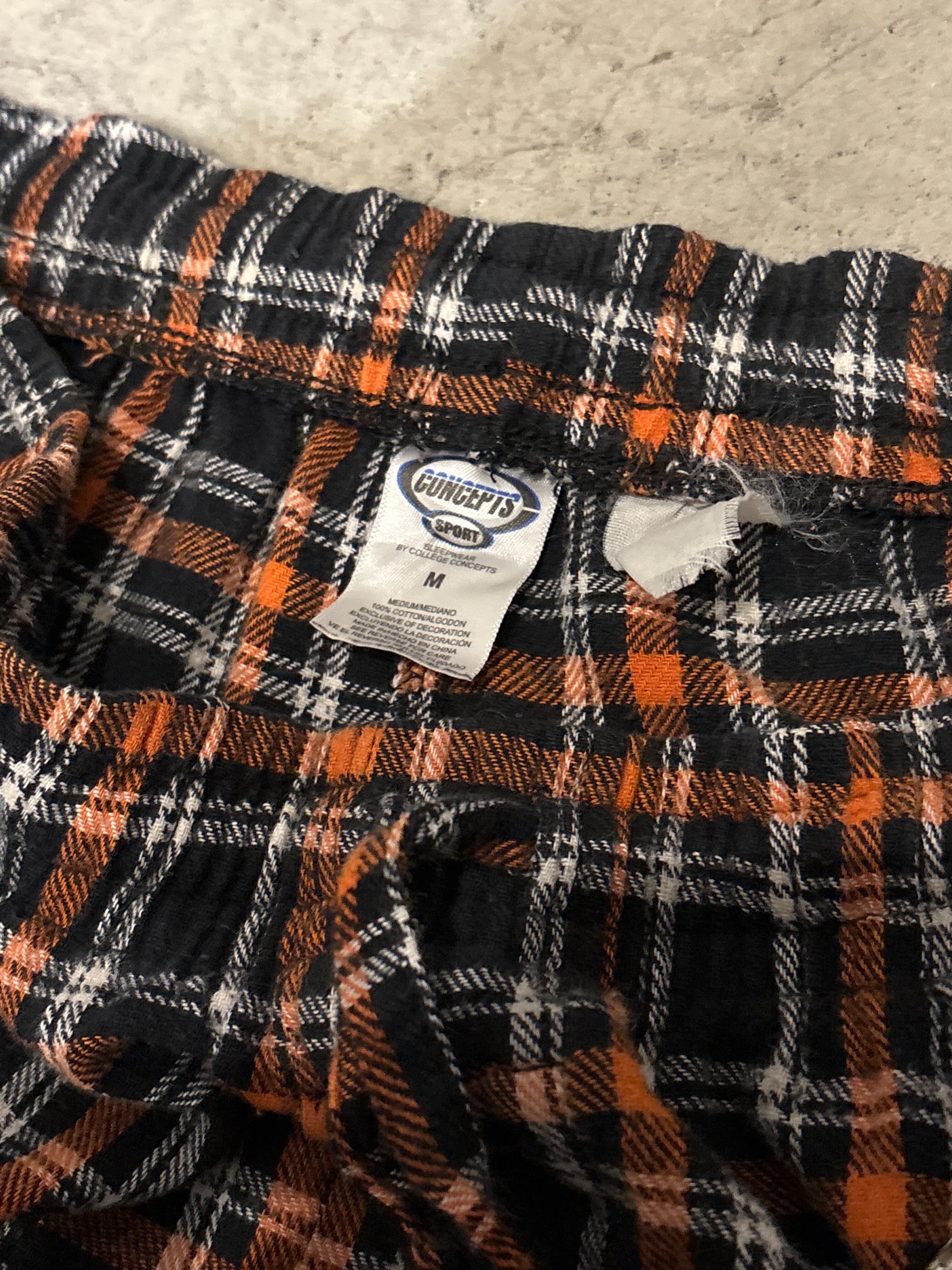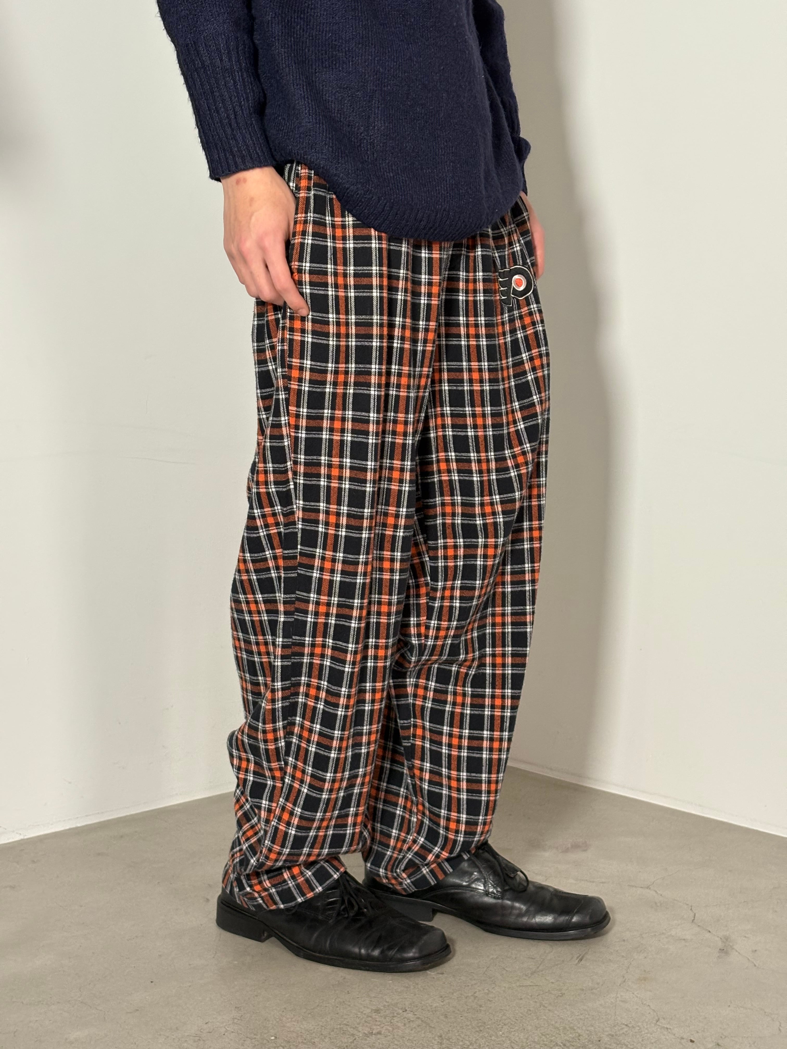 オレンジとブラックのカラーリングのチェックパンツ。